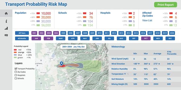 Tool development involves hourly air parcel trajectory modeling at a fine spatial scale for California and Nevada using high-resolution (2 km) meteorological data from 2001 through 2020. Modeling results will determine the probability of air parcel transport from any location within California for multiple time scales (e.g., week, month). A geospatial risk score will be generated by integrating air parcel transport probabilities with population data and other relevant information (e.g., school and hospital locations). Historical statistics of weather parameters relevant to fire and smoke conditions (e.g., relative humidity, temperature, mixing height) will be developed from the climatology for any given location in the domain. The trajectory modeling and climatological analysis outcomes will be implemented into a simple and interactive online dashboard. Air and land managers can use the dashboard to plan prescribed fires, which will allow for more timely public messaging regarding potential smoke impacts and proactive mitigation efforts to assist at-risk populations.