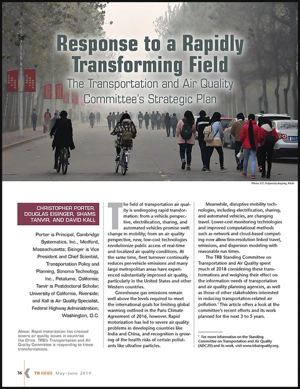 From rapid motorization in developing countries to the increased use of ride-hailing services and electric vehicles in the United States, the transportation-air quality field is undergoing rapid transformation. Sonoma Technology’s Dr. Doug Eisinger, past Chair of the Transportation Research Board’s (TRB) Air Quality Committee, co-authored Response to a Rapidly Transforming Field: The Transportation and Air Quality Committee’s Strategic Plan, which was published in the May-June 2019 issue of TR News magazine.